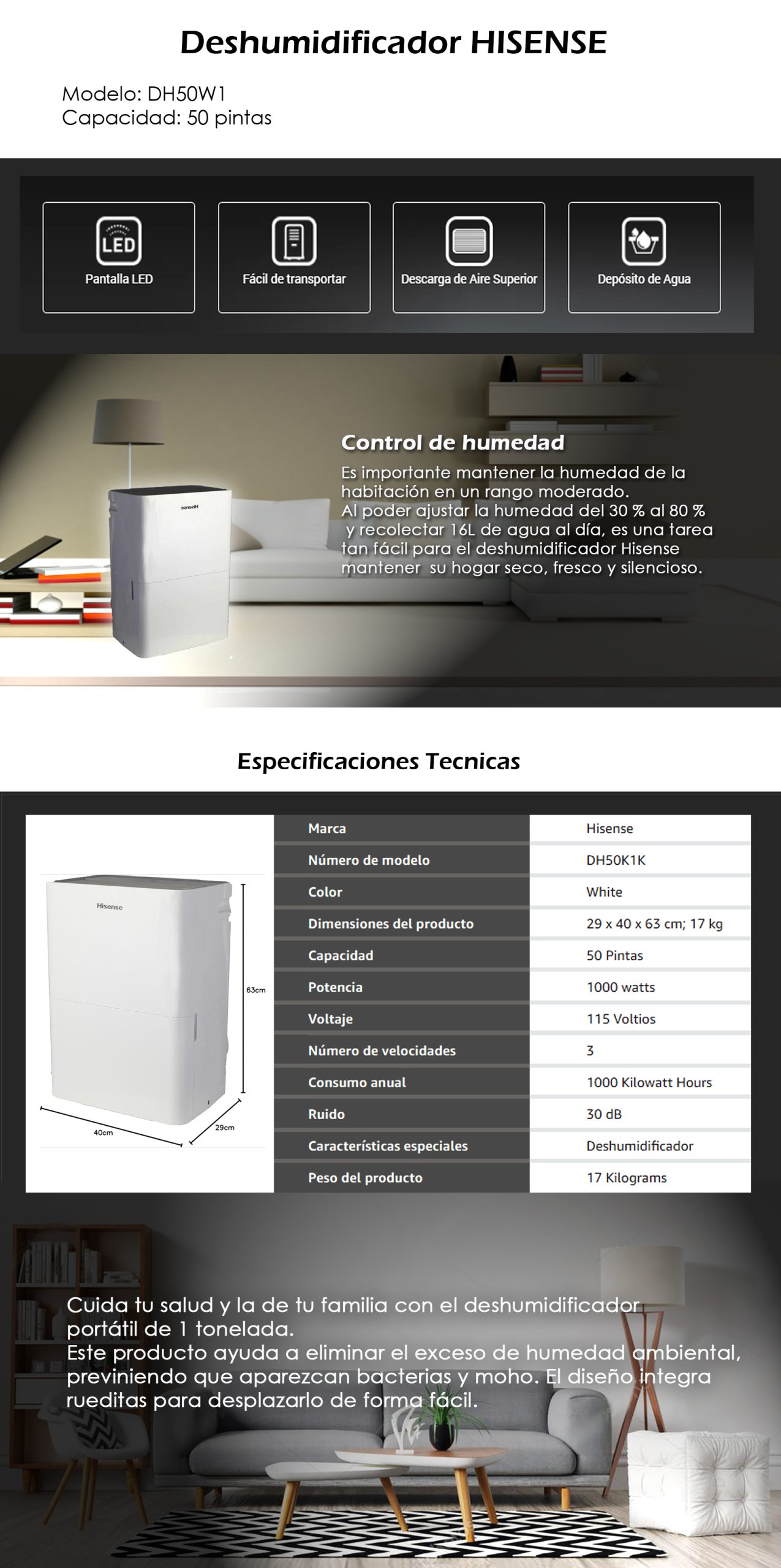 Cuida tu salud y la de tu familia con el deshumidificador portátil de 1 tonelada. Este producto ayuda a eliminar el exceso de humedad ambiental, previniendo que aparezcan bacterias y moho. El diseño integra rueditas para desplazarlo de forma fácil.